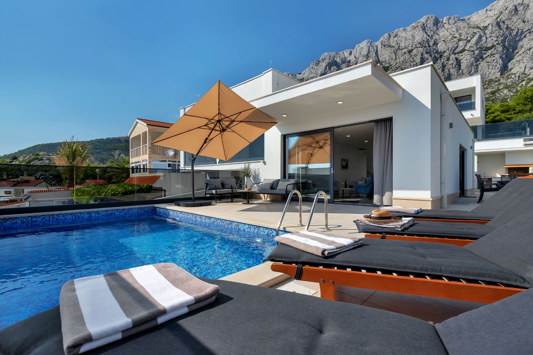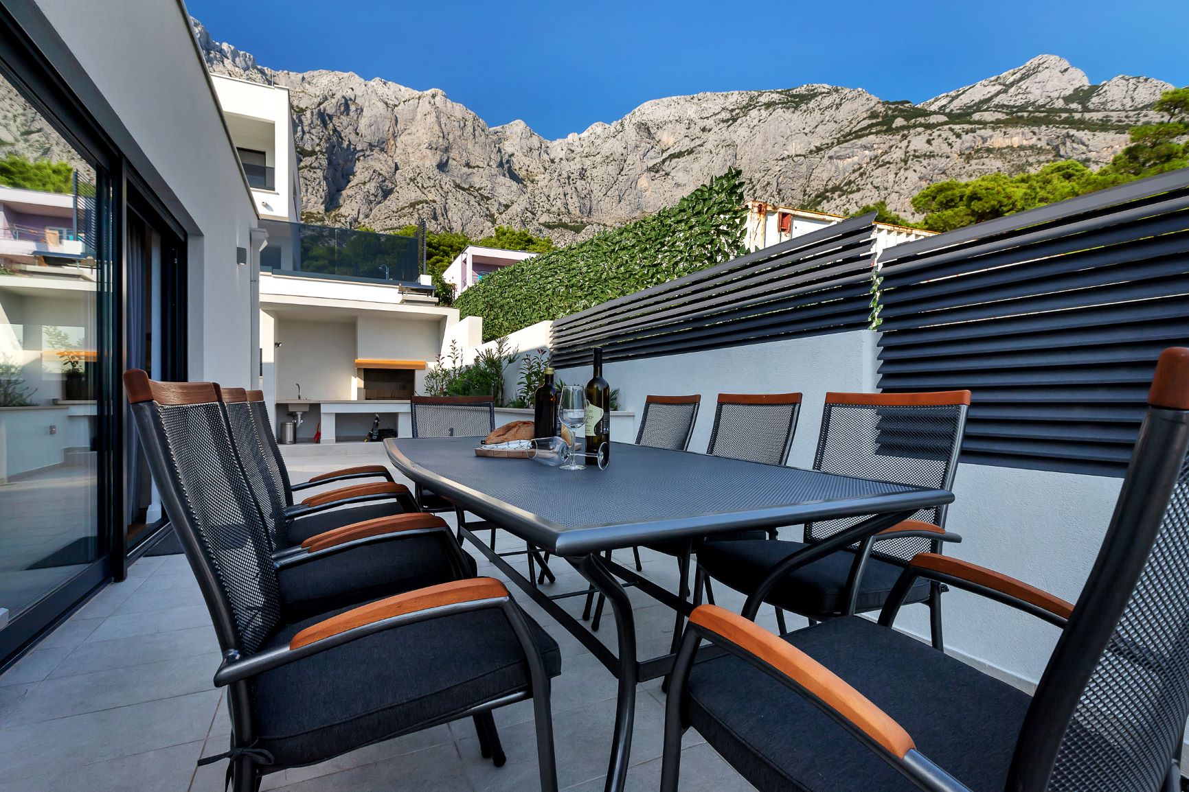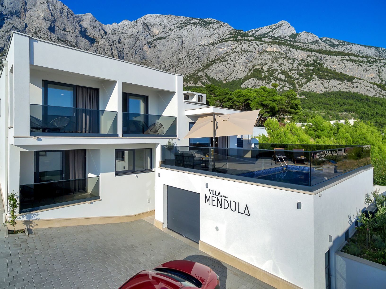 Villa Mendula is a spacious and luxurious house located on the mountainside of Makarska. It is situated few minutes drive from Makarska town and beautiful Makarska beaches. This new villa is surrounded by mountain view of Biokovo and panoramic sea view of the Adriatic Sea. This beautiful house offers absolute rest and relaxation. Villa “Mendula” offers holiday comfort up to 8 persons.