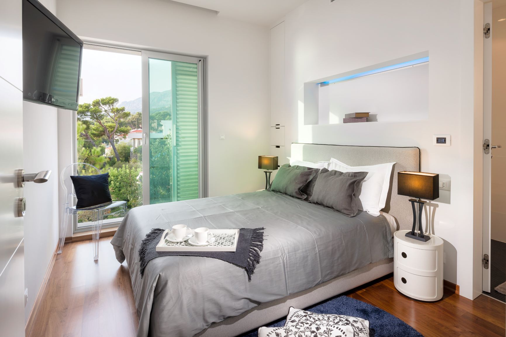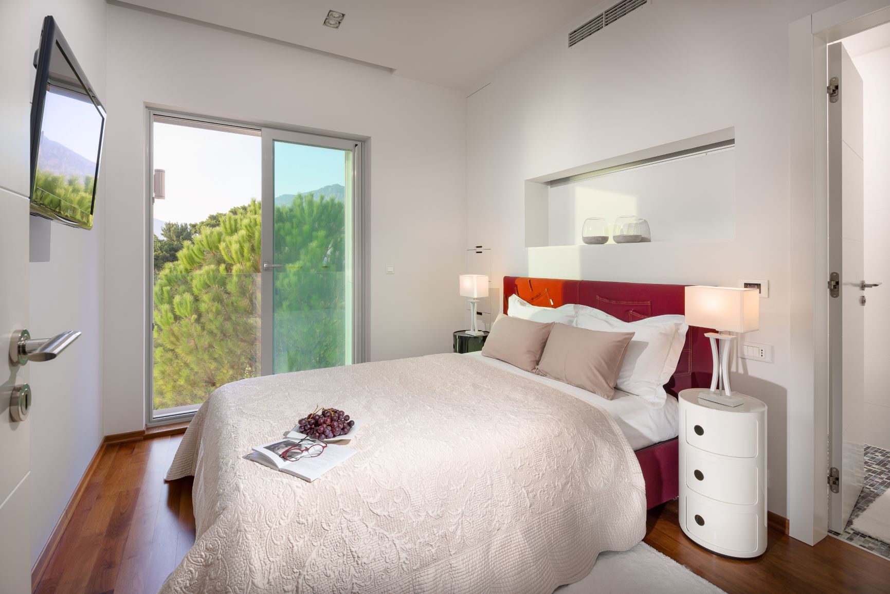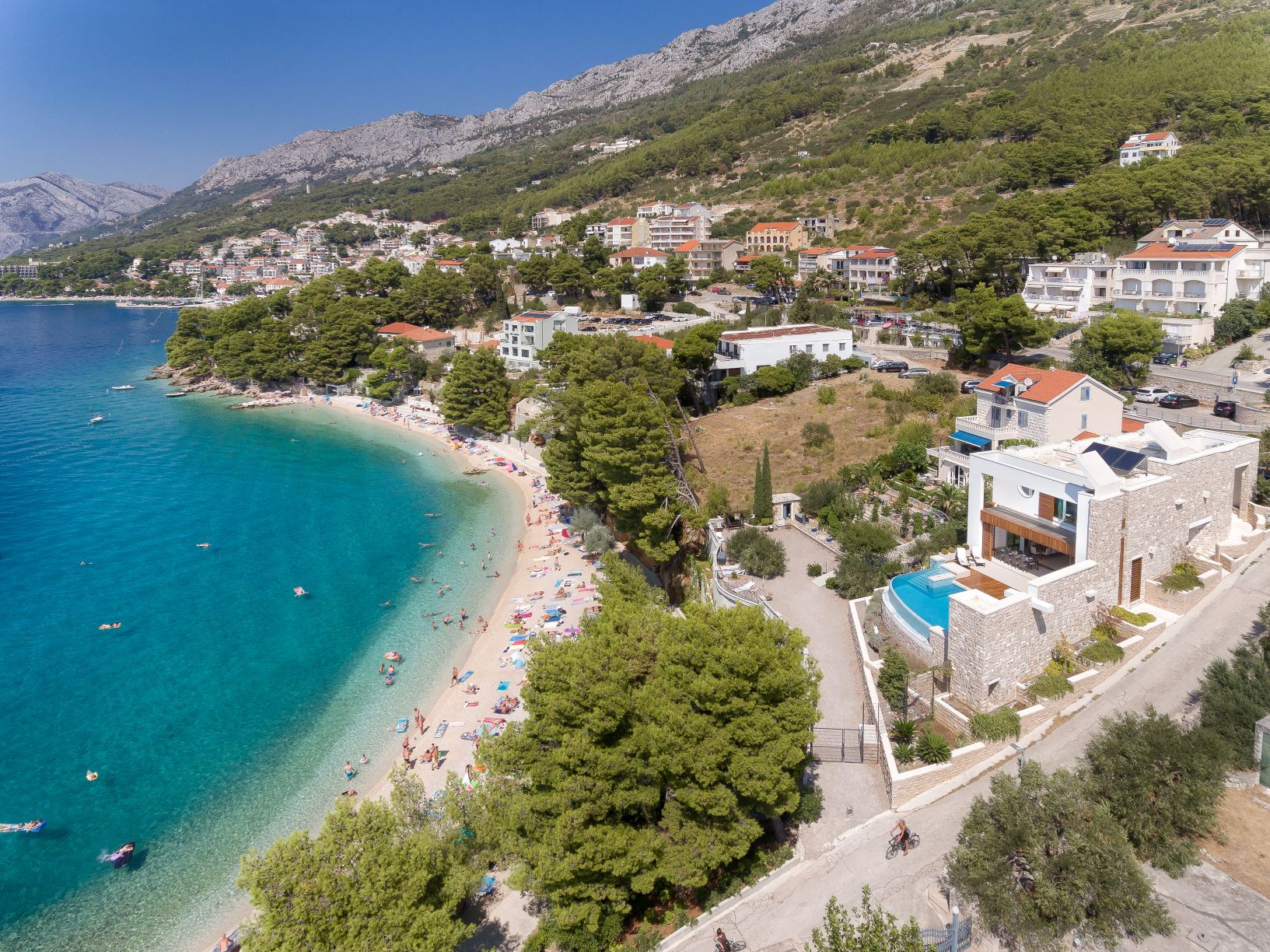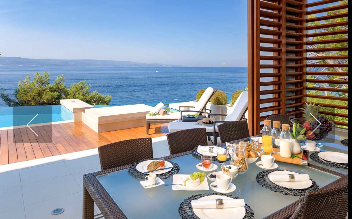 Each of the five bedrooms at Villa Regina is equipped with en-suite bathroom, air conditioning, ceiling fan, flat screen TV and French window confronting the sea. A Master bedroom has a King size bed and its en-suite shower and bathtub facing the sea. This Villa has a bright open-plan kitchen, dining room and sitting area equipped with a huge TV screen which can be hidden in the floor not to spoil the marvellous sea view. Just steps away from the beach, you and your guests can enjoy the peaceful holiday. For a little more action, the centre of the Brela is 10 minutes’ walk away.