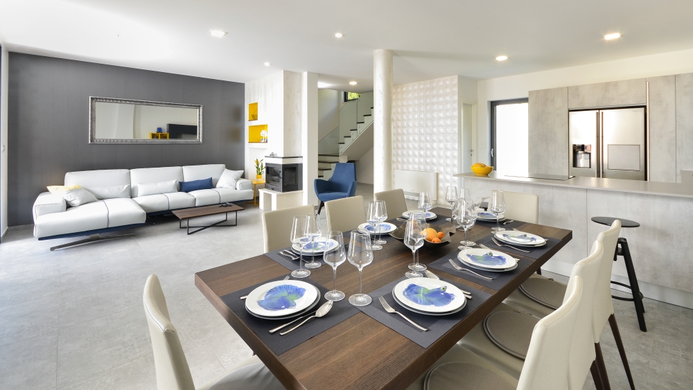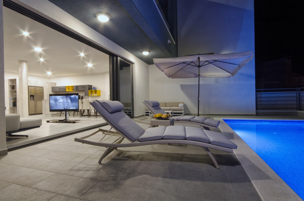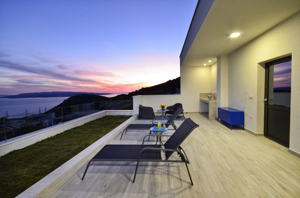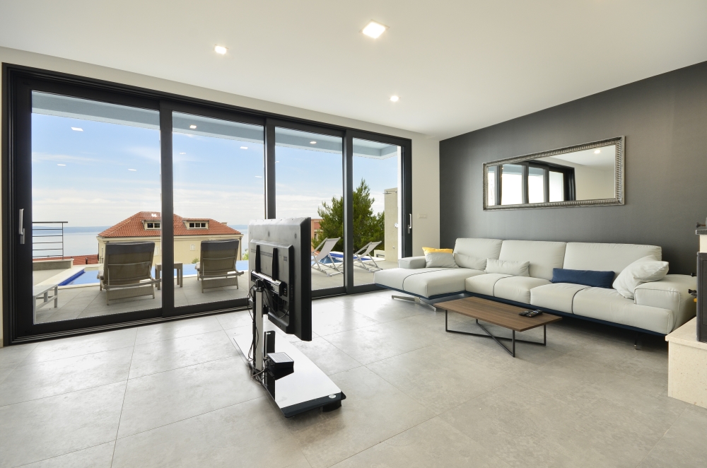 The first floor features 3 bedrooms each with their own bathrooms. Two rooms have terraces which overlook the stunning Adriatic below and the third bedroom boasts beautiful views of the majestic Biokovo Mountain. All rooms feature queen size beds, two of them are with built-in closets, one with wardrobe and all of them have beautiful bathrooms with luxurious glass showers.