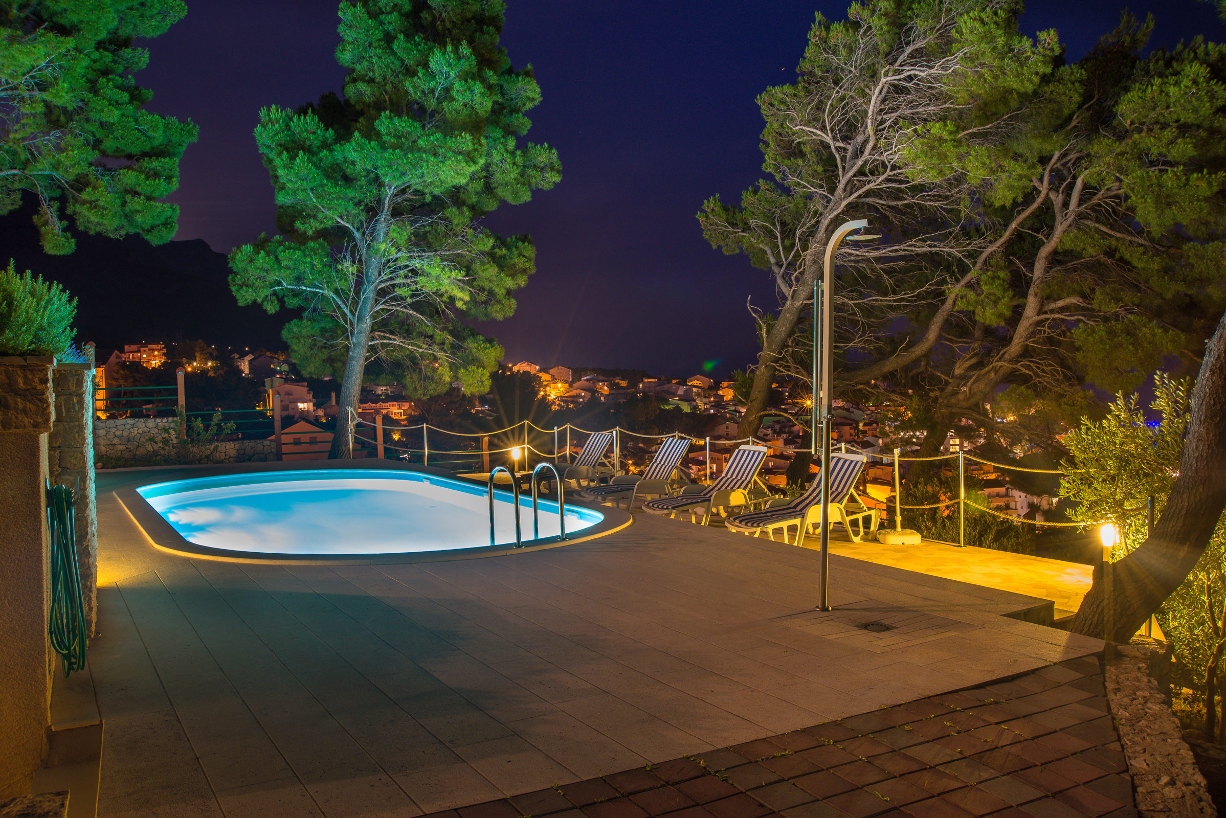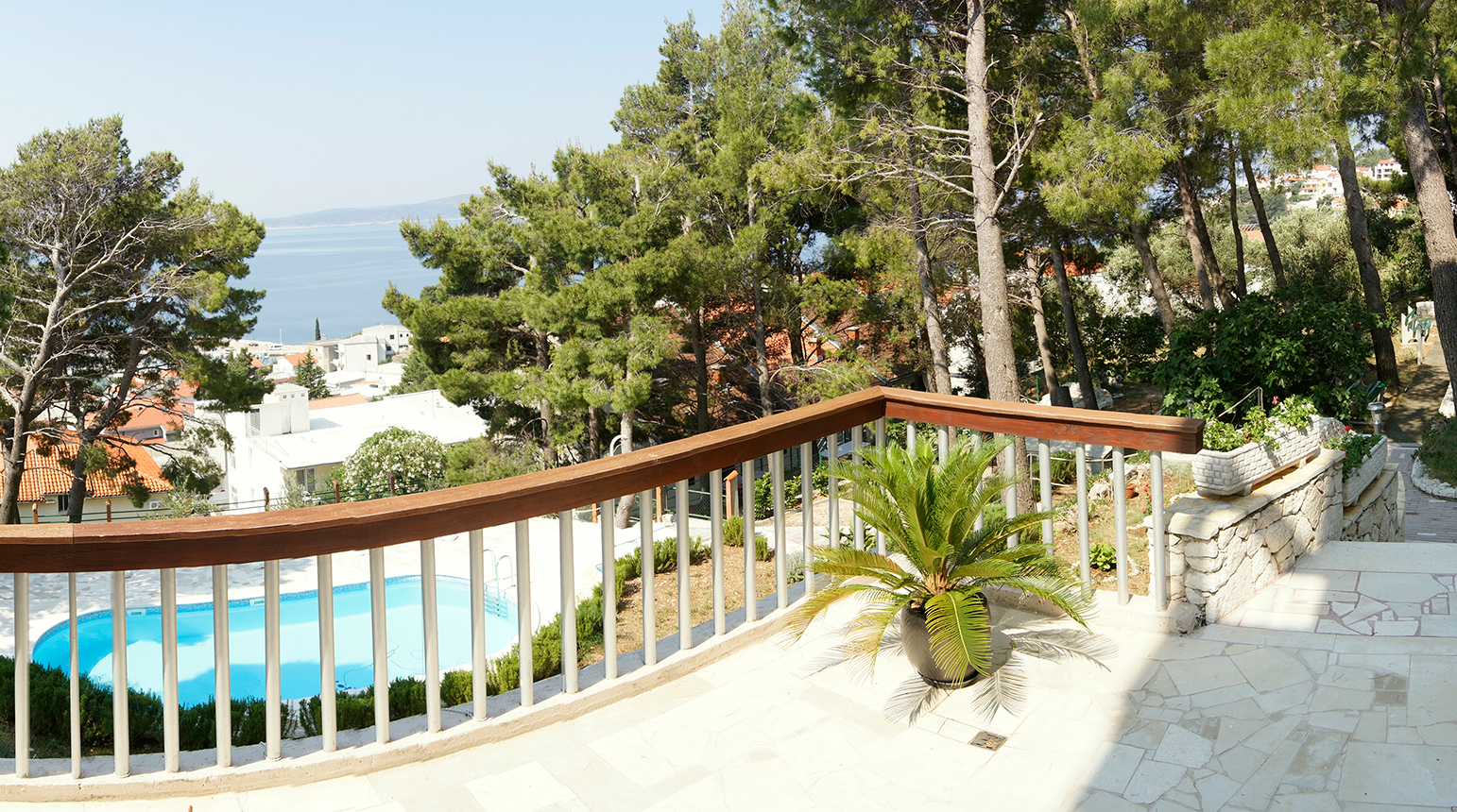 Villa Biokovo has sea view between pine trees - the comfortable house is located directly above the famous seaside resort Baska Voda. 3,000 sqm of land guarantee peace and quiet despite the city and a picturesque view of the sea. Apartments Villa Biokovo with a private heating pool is ideal for families, couples and group friends that will enjoy the stunning sea view.