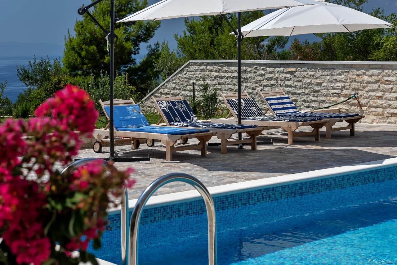 Private outdoor pool with sun loungers and sunbathing area