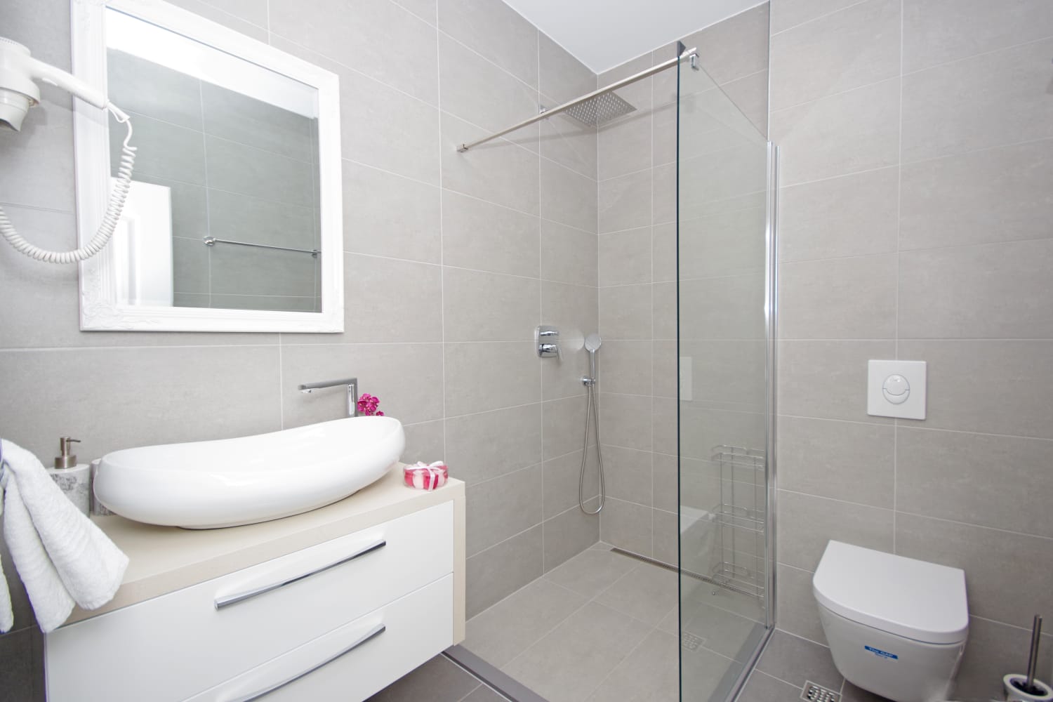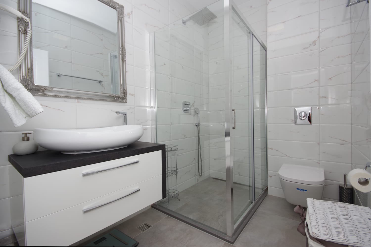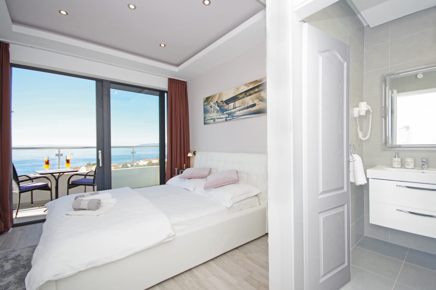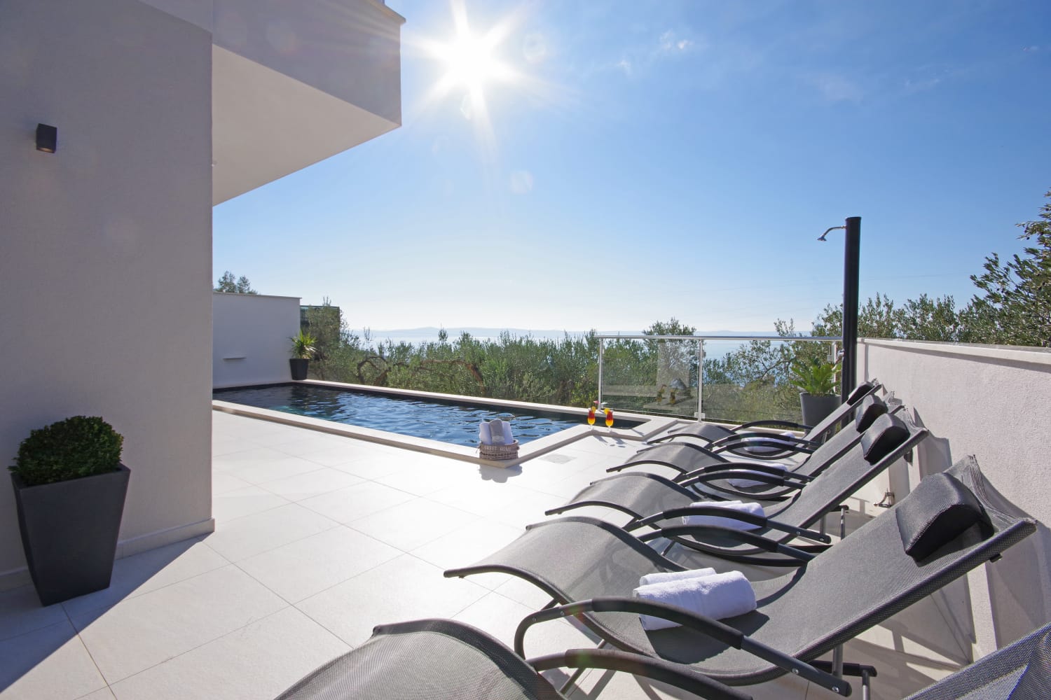 Villa Andy consists of a total of three bedrooms. Each room has its own bathroom. On the ground floor there is a spacious, modern living room with an open kitchen. The living room opens onto the terrace and pool. Outside is a terrace with an outdoor heated pool (2.5 x 8.5 m) and a beautiful view of the sea and the nearby islands, Brac and Hvar. There is also an outdoor shower, sun loungers and a barbecue.