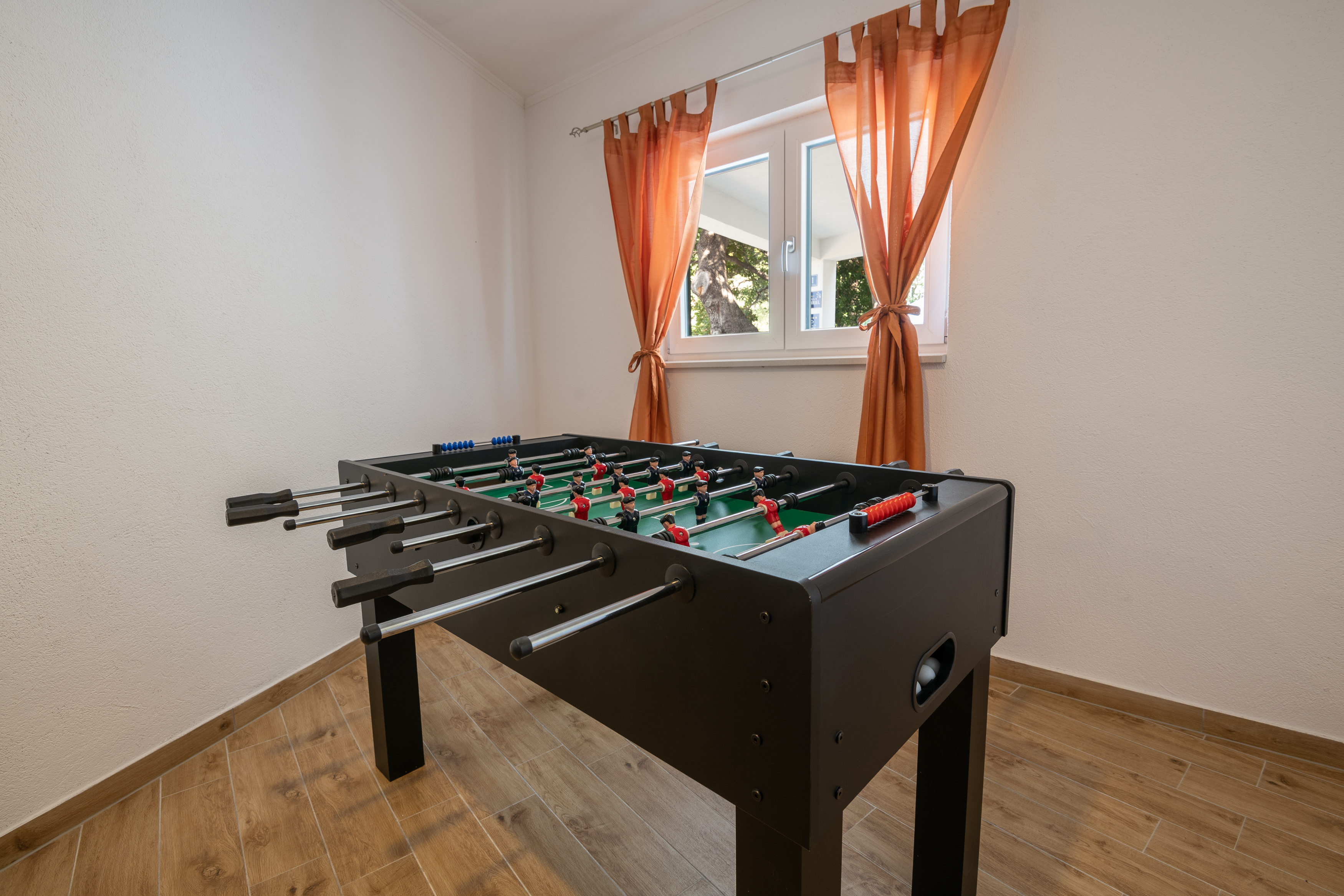 Villa consists of basement, ground floor and first floor. On the ground floor there is a spacious living room,fully equipped kitchen with dining room and bathroom with bath and wasching maching. At the first floor there are two bedrooms with king size beds and bathrooms. Both rooms have southside balconies from which you can enjoy your morning coffee while watching the sunrise. Basement is equipped with fitness room,jacuzzi,sauna room, and room with picado and billiard table.