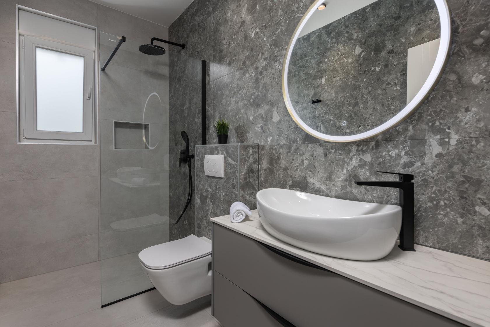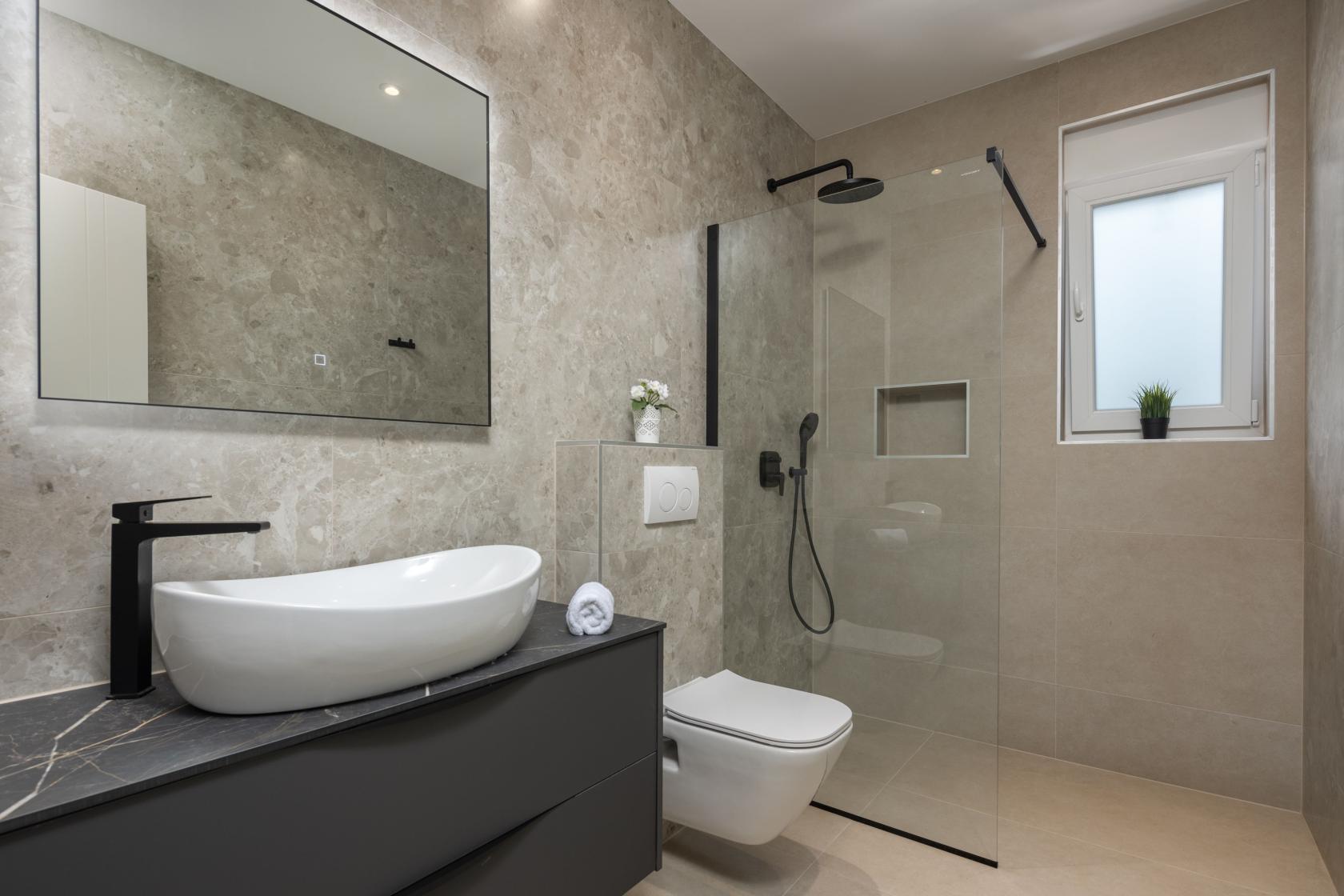 5 modern bathrooms with walk-in showers, fresh towels, and complimentary toiletries